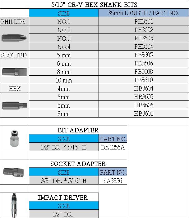 13-Impact Driver Bit, 5/16" Hex * 36mm